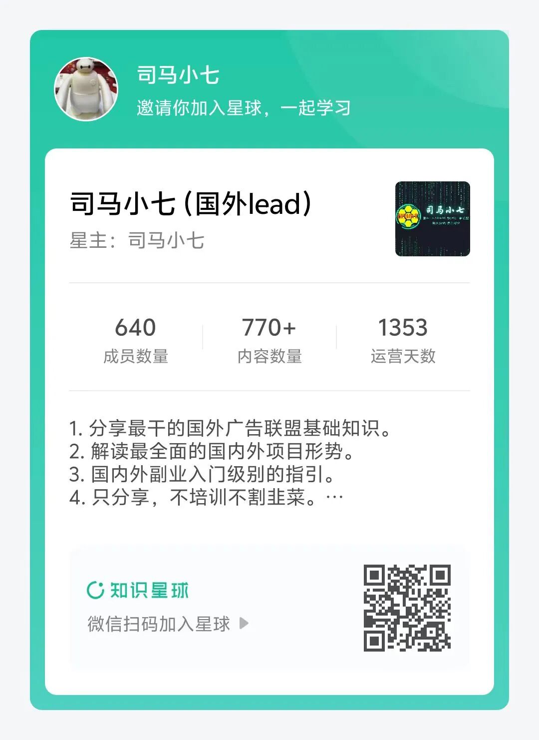 大家好!我是司马小七,司马网创基地创始人。从事国内外互联网项目研究20年,早年专注于国外LEAD、广告联盟的研究工作,现在注重分享互联网项目拆解和资源共享。