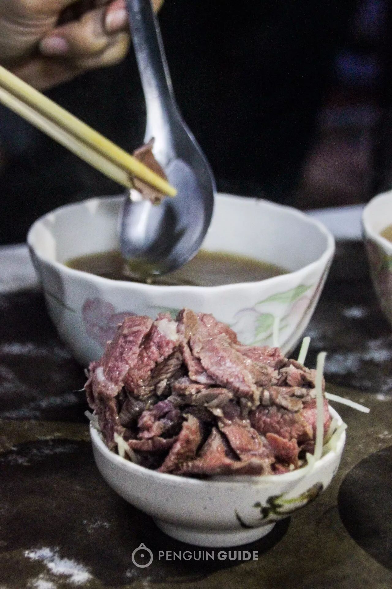 牛肉片手切现切,热汤高高一注,肉片现出赭红色泽。蘸上油膏和些许姜丝入口,柔嫩鲜甜。