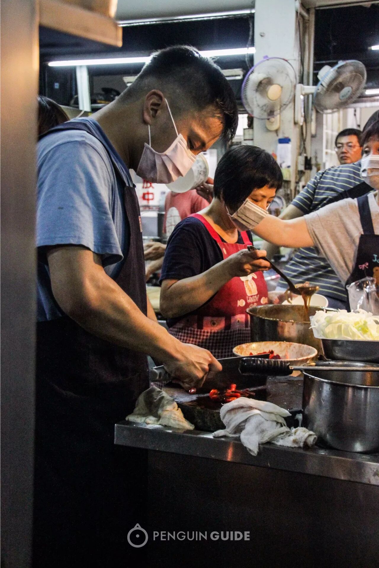 相传鳝鱼意面这道台南小吃,就是阿江发明的。竹篓上摊着猩红鳝鱼,姿态诱人,竹篓里头垫着冰块保鲜。几片鳝鱼快刀落,下锅翻炒,挥动锅铲,起锅盛盘,一气呵成精准到位。