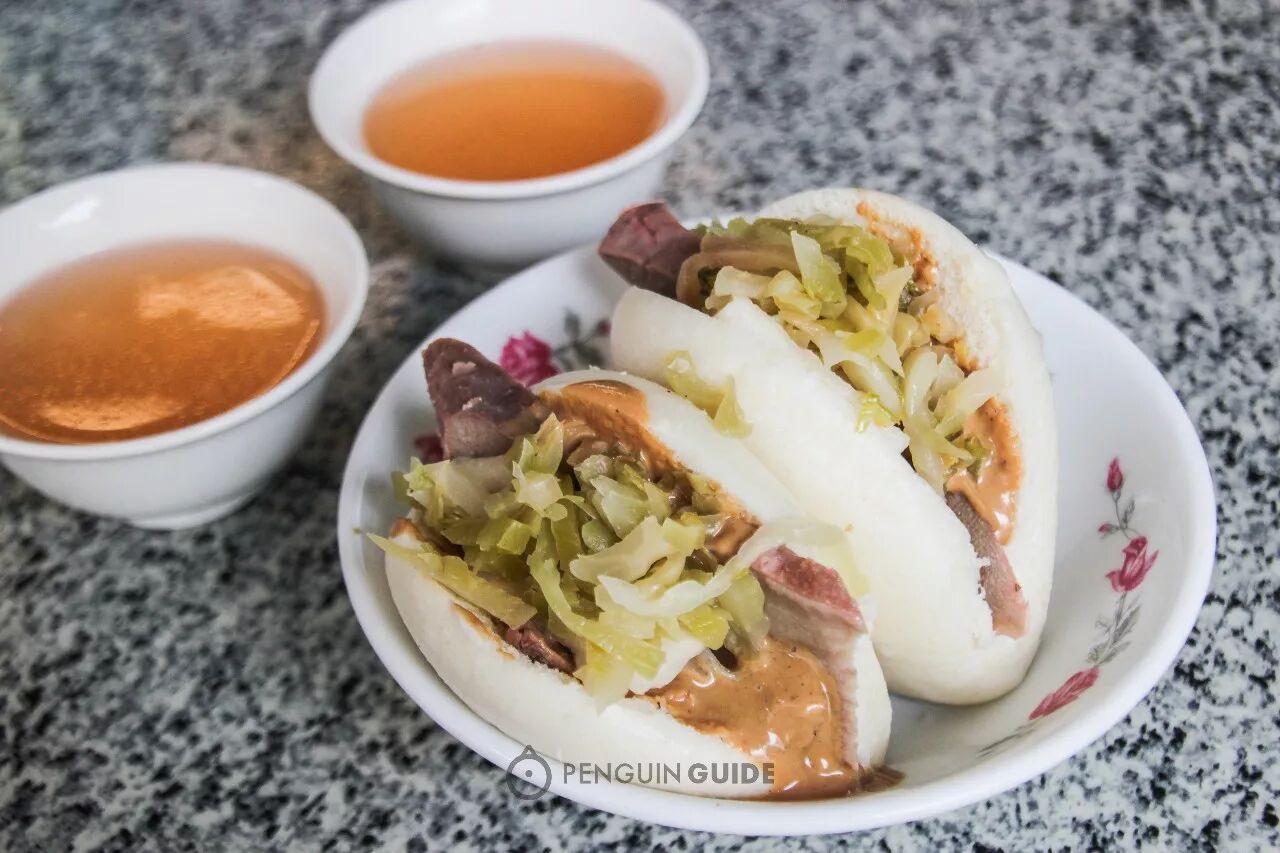 传统割包夹的是肥猪肉,阿松却以更健康有质感的猪舌取而代之,淋上麻酱跟酸菜,软软的甜里带一点酸香,清爽滑脆。堂食还提供肉汤,鲜味十足。
