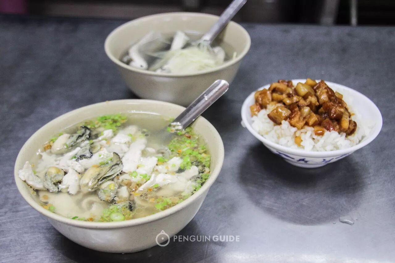 台南的咸粥或许称作“汤泡饭”更合适些,米粒饱满分明,在鱼骨熬制的清澈汤头中沉浮,虱目鱼肉及蚵仔(海蛎)鲜明清新,撒上芹菜末与油葱酥点缀,平添一股香气。