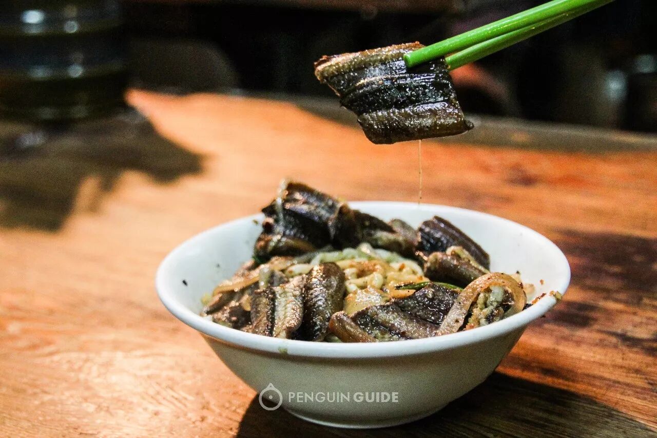 昏黄灯光暗暝天色,手起刀落,红艳鳝鱼下锅快炒,轰轰作响一起呵成,路过黄记,很难不被这幅“高手在民间”给迷住。