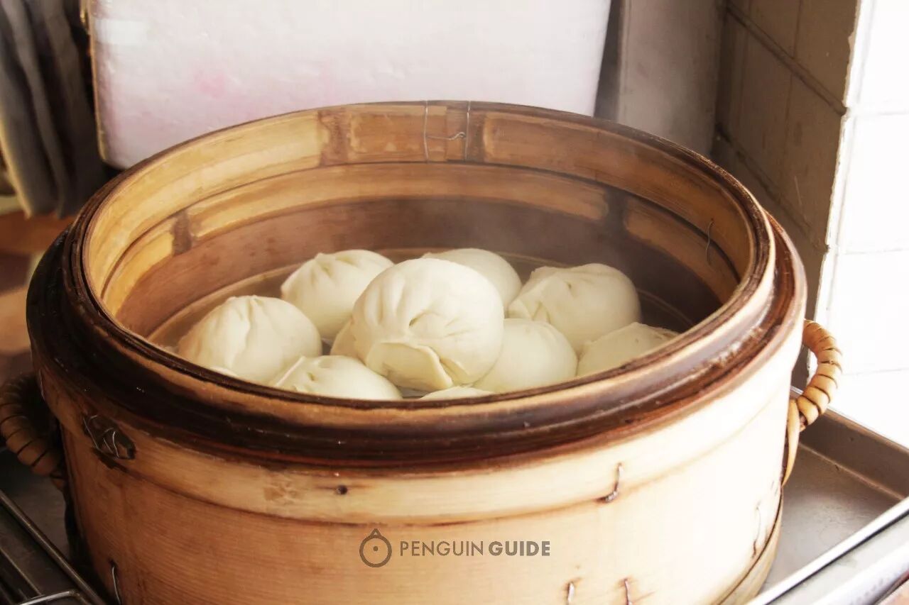 阿姨掀开蒸笼,包子白胖胖煞是可爱。肉馅经手工捶打,扎实又多汁。