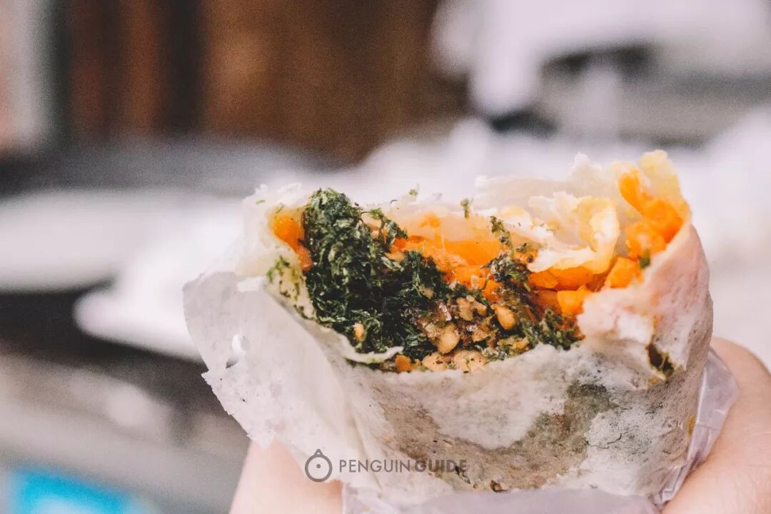 ▲店里也可以买到做好的现成品,饼皮又嫩又Q,包着胡萝卜丝、浒苔、花生碎、鱼卷、豆干。