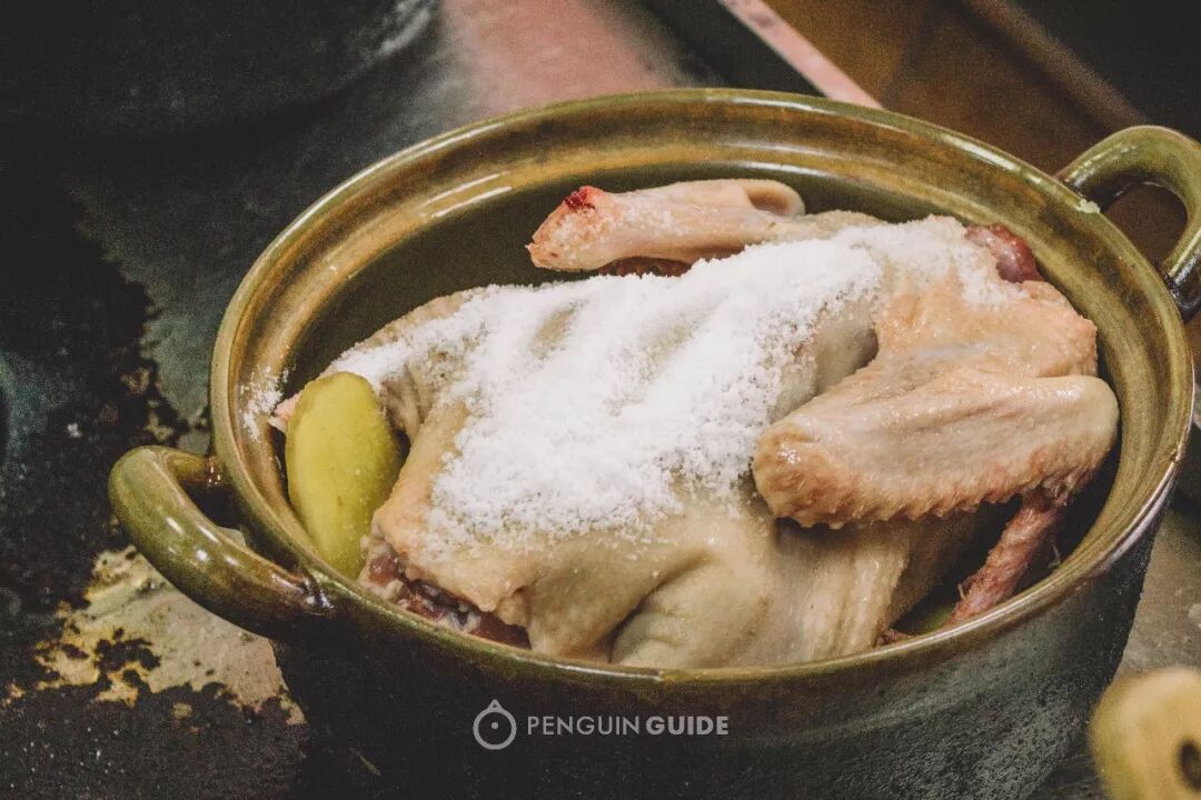 ▲整只带头带爪的番鸭抹上盐,加姜母盛于砂锅中,再把砂锅埋入敞口铁锅里的沙堆和粗盐中加热,要炖3个小时。