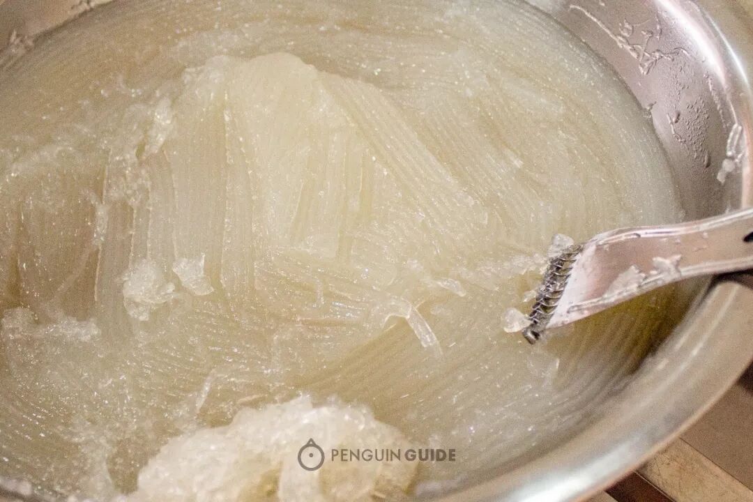 四果汤里有样很特别的食材,拿小刮刀在盆子里把一块透明果冻状的东西刨出细长条。那个是石花膏,用海边礁石上的石花草(一种食用海藻)熬制而成的。