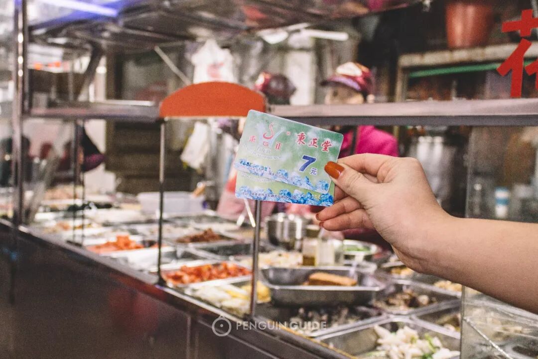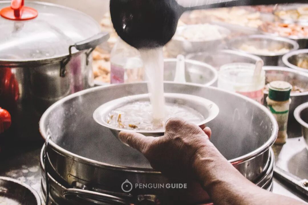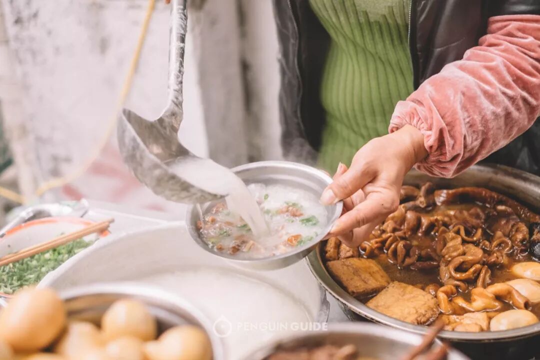 ▲锅里是热乎乎的清糊和各色卤味。透明橱窗里花样繁多的配料,被吊起来的小灯泡照得格外诱人。这家的配料选择蛮多,可以多选选,我们加了猪尾巴!