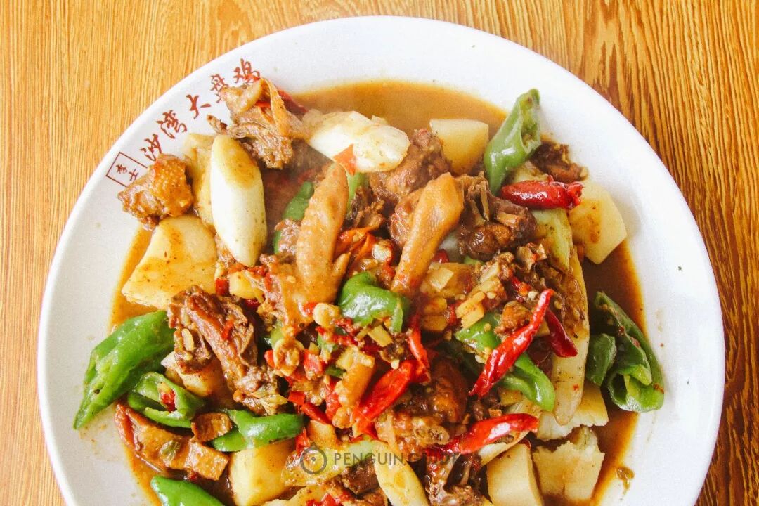 一派是搭配土豆大葱汤汁丰盈的沙湾大盘鸡: