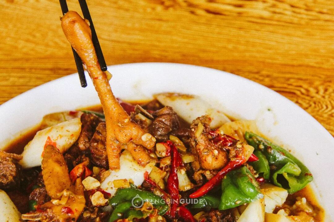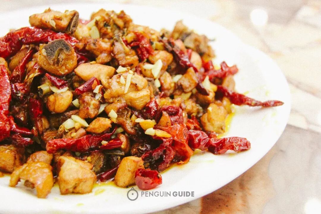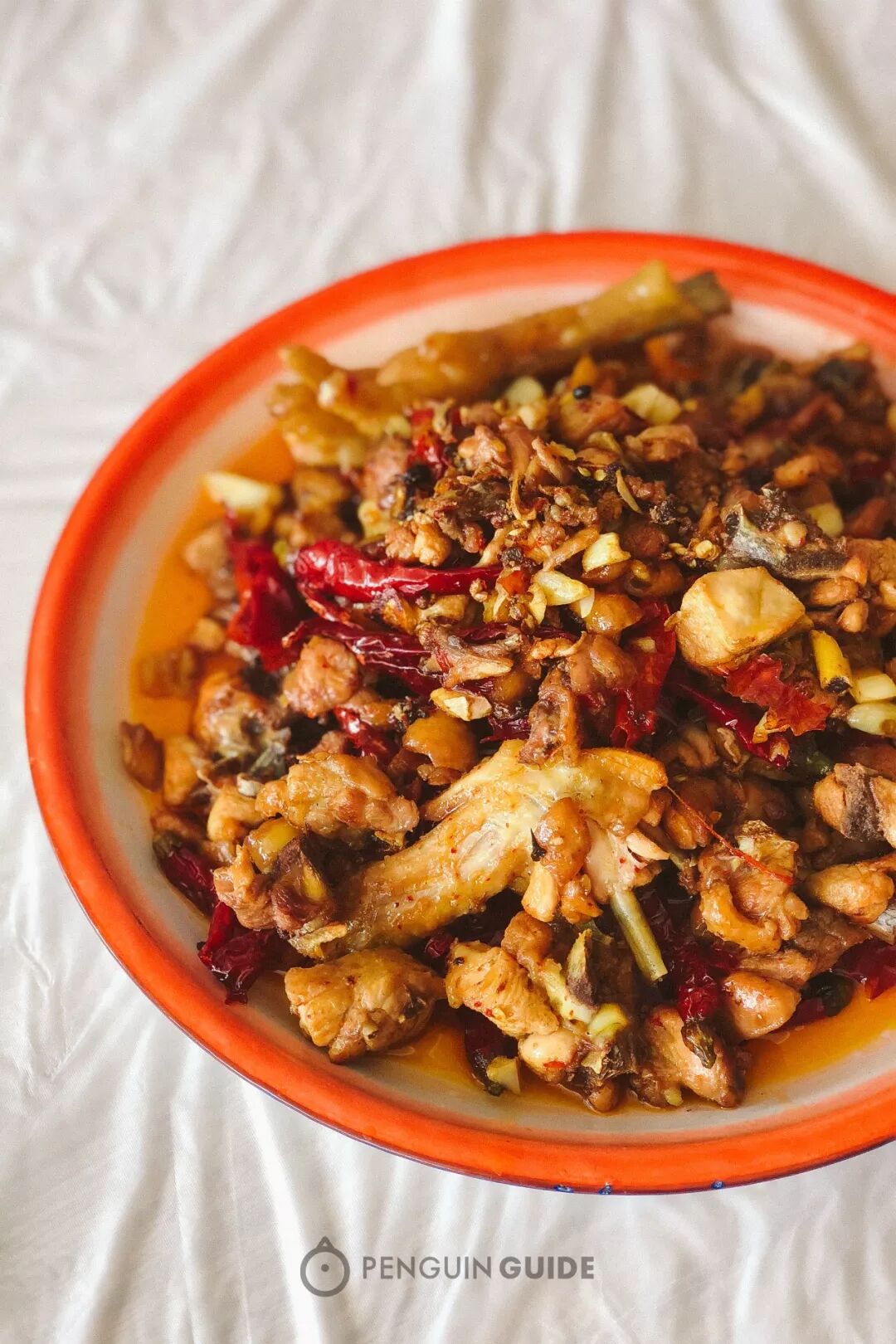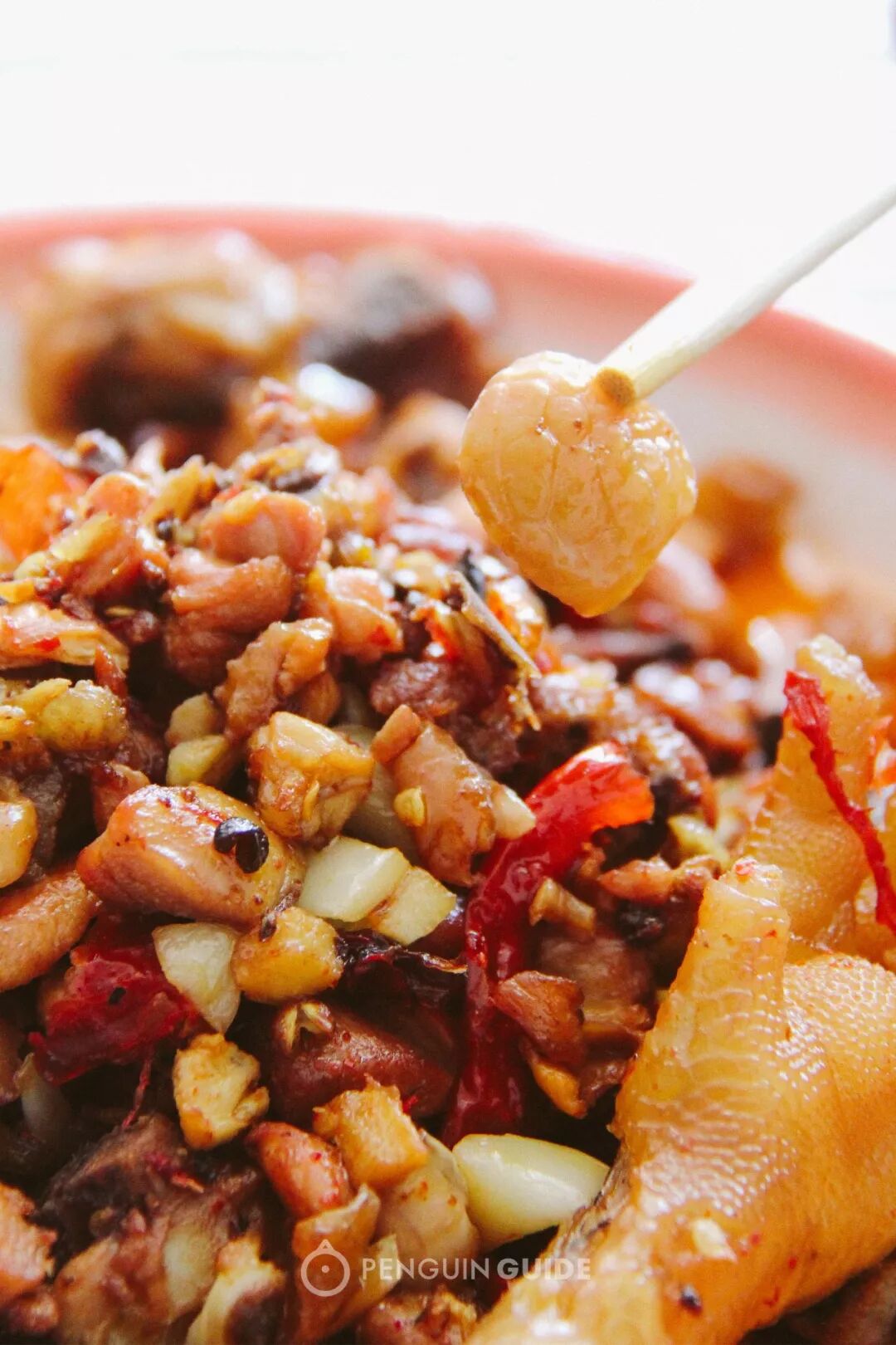 鸡肉鲜、香、热、辣,比别家多了一些胡椒调味,口味更加奔放。辣椒用了果肉厚厚的线椒,嚼起来可以吃到晒干的辣椒肉,香喷喷!