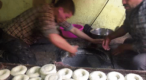 馕的原料很简单,发酵的面粉,不加碱,只用少许盐。将面饼擀得厚薄均匀,用手捏出一圈馕边,再在饼面上戳满好看又规律的小洞,沾上洋葱末,芝麻等辅料,在底部沾上少许盐水,由馕坑师傅牢牢拍在馕坑壁上烤制而成。