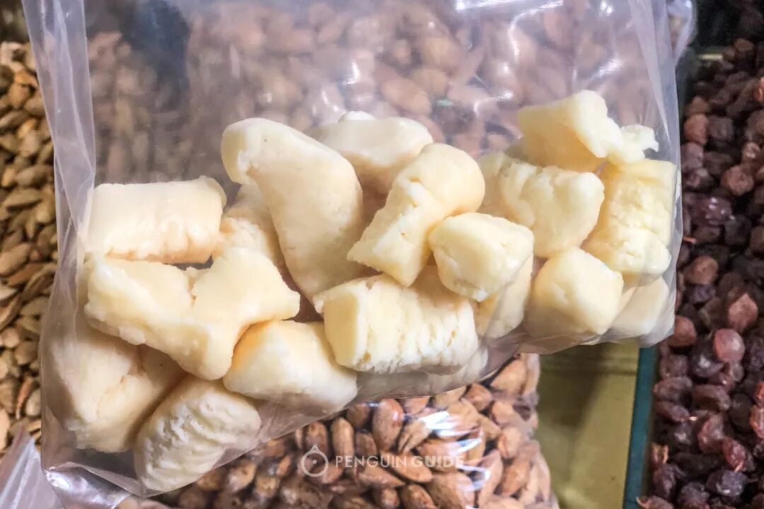 但想提醒你,酸奶疙瘩是牧民当干粮吃的,有很重的奶油味,期望值别太高。你常在淘宝见到的“红枣味酸奶疙瘩”和“奶条”,成分大多是奶粉。如真正的奶疙瘩,得去牧区才有。