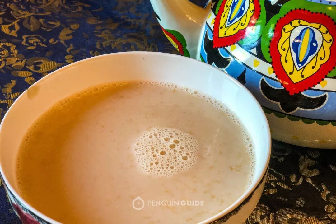 不是让杰伦上瘾的那种奶茶哈。新疆奶茶用砖茶、鲜牛奶和盐熬出来,是咸口的。茶香、奶香在嘴里融合起来,真正的鲜奶茶,完全不担心反式脂肪酸;)