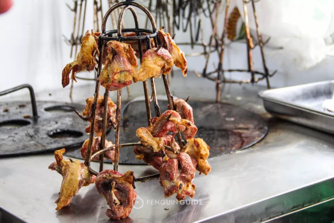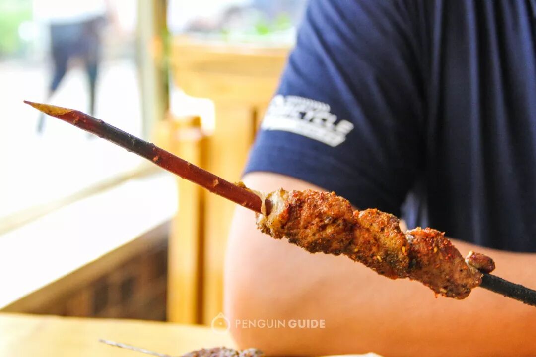 将红柳枝干上多余的小枝打掉,顶部削尖后,串上大块预处理过的羊肉烤制,就是每次都会贵几块的红柳烤肉。红柳枝干中的果木香一边烤一边渗进肉块,多汁又鲜嫩。