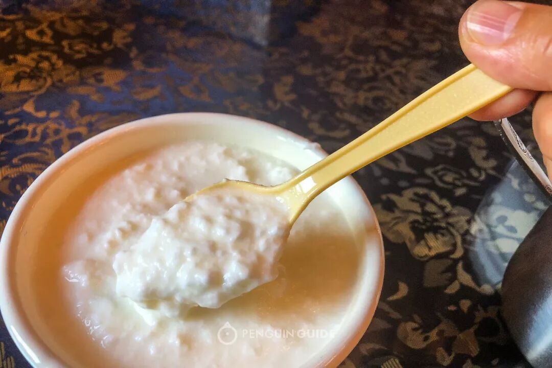 在新疆,牛奶可以有好几种变身。正宗的新疆酸奶,很酸很酸,颗粒感比较强,吃到嘴里还能感受到发酵产生的气体:
