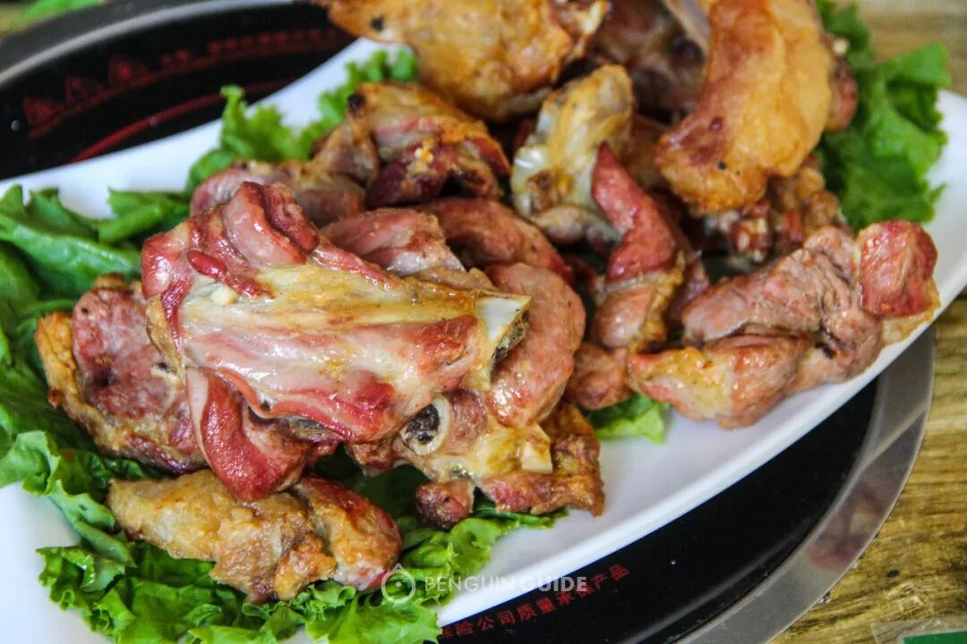 天山以南的架子肉,注重调味,在羊肉表面涂上由盐、蛋黄、姜黄、孜然粉等调料混合而成的调料,烤制之后色泽也会变得金黄诱人。这次我们吃了天山以北的做法,预处理的时候只简单去腥,羊肉自带清香,非常鲜美!