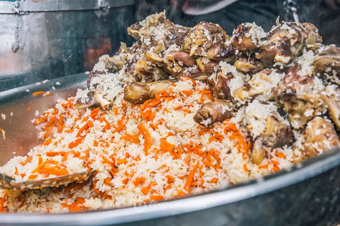 抓饭特别讲究,7种原料肯定少不了:胡萝卜,洋葱,羊肉,羊油,大米,盐和水。放入大块羊肉反复翻炒,之后加入胡萝卜和洗好的米焖煮。