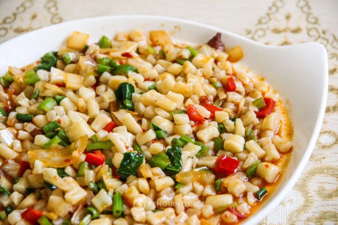 其实这道菜里面并没有什么大补的食材,只是把面切成小小的颗粒,再加入蔬菜,羊肉炒制而成。因为新疆的面筋道,而小丁丁完美化解了面条过硬的毛病,所以丁丁炒面口感更柔和。