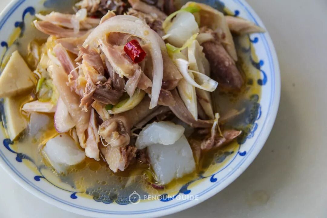 这道以“麻“为主题的菜里,用鸡汤、花椒油、线椒、葱段熬制的麻油才是整道菜的灵魂:整鸡高汤熬制,手撕成小块,加上新鲜洋葱,葱段,淋上几勺温热的麻油: