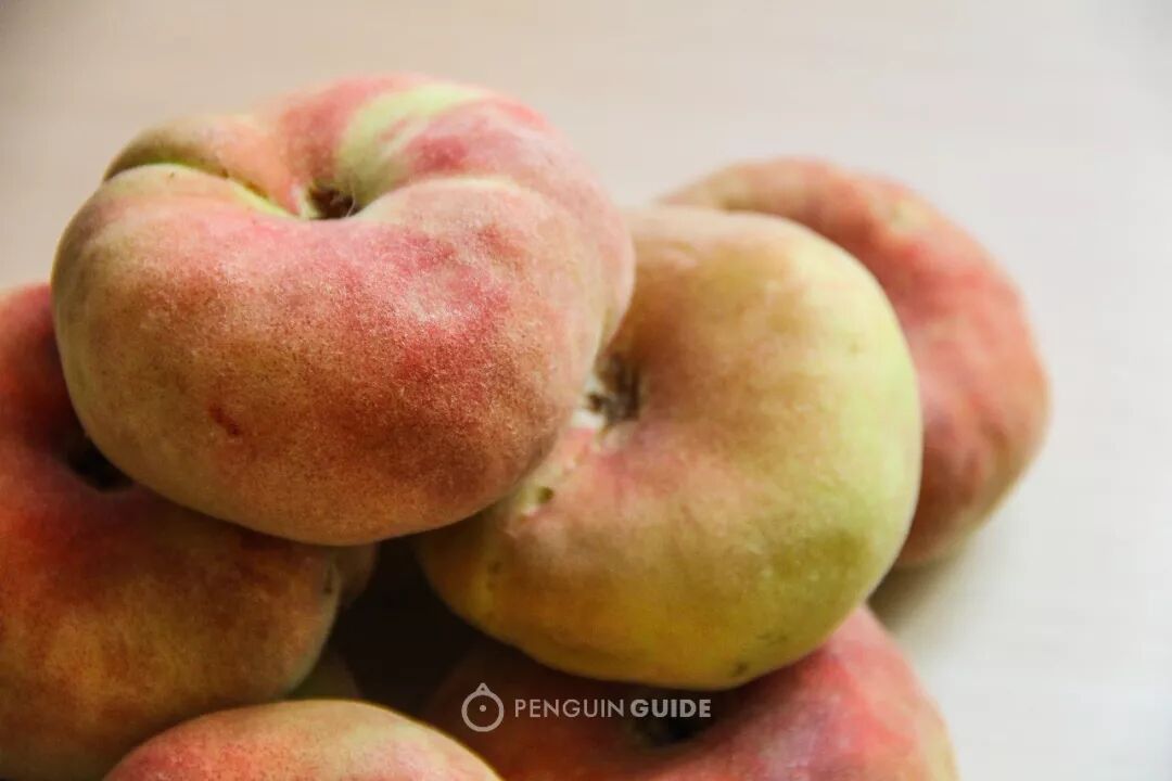 蟠桃原产于新疆,也是王母娘娘生日趴体的御用水果。它外形讨喜,活像块长了一个酒窝的酥饼。
