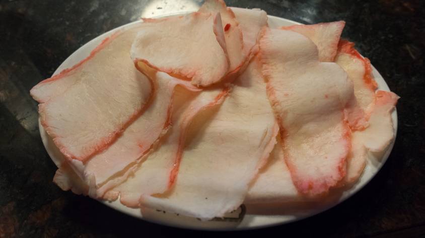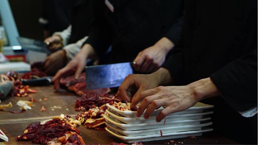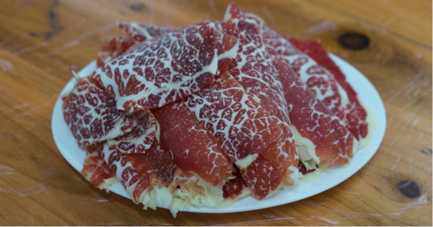 切分要带筋切,对刀工要求也高肌理细致,切片纹理像树叶一般。