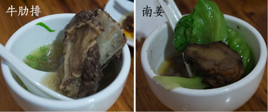 待锅中牛骨汤沸腾了以后,舀一勺芹菜末儿到自己碗里,盛一碗清汤先喝着暖胃。千万别把芹菜丢进锅里,虽然在外地很多店家的汤底里就放了芹菜和玉米,但是若在汕头,这种做法可是要被当成异端的 — 丢进汤里的芹菜味儿,会串掉之后牛肉的原味的。