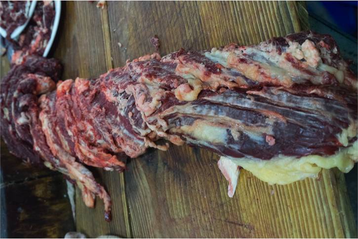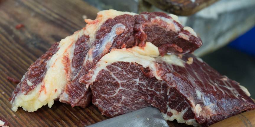 匙仁靠下的部位,产量较匙仁稍大。匙柄切成大片,无论肥瘦,中间会有一条明显的肉筋纹路,像钥匙柄一样,入口柔软又超弹,极有拉伸感。