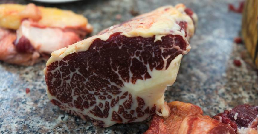 颜色:新鲜牛肉的色泽鲜红光亮、弹性良好,肉纹饱满,脂肪和肉质不松散,手感不黏,而是温润多油;脂肪部分乳白色或呈浅奶黄。次鲜肉表面没什么光泽,色泽呈现紫红色或者脂肪颜色黄灰;冷冻过久或储存温度不当的肉通常颜色暗红。