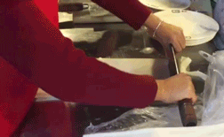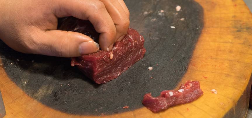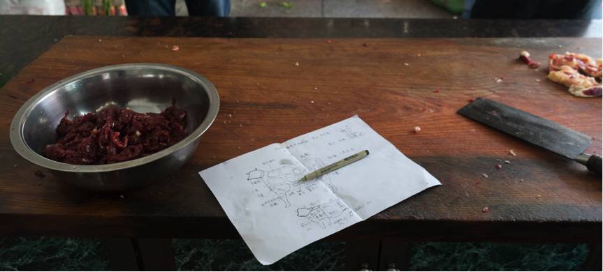切牛肉必然是讲究刀工的,如何把一块肉按照纹理,切得漂亮口感又好,也是需要多年经验的。切的不好,很可能就纤维太长难咬,或者舌感粗糙。切肉的师傅说,每天切完肉,左手比右手酸疼,因为要大力按住肉在案板上。