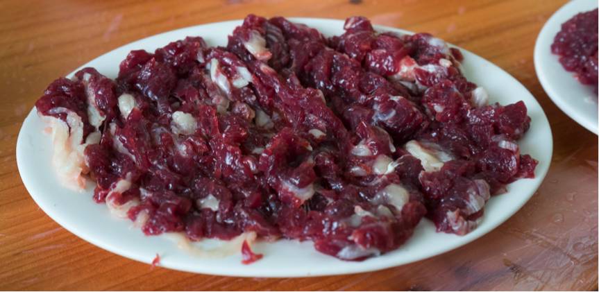 潮汕人好牛肉,但鲜牛大多并非潮汕当地所产,而是活牛从四川贵州等地运来,饲养一阵再用。这是当前讲究新鲜质量,“热气”直送餐档,而并非拘泥土产的趋势。以前农户就牵着牛到市场赶集,在找到合适卖主后,就在市场里宰牛分送各食铺,不经过冷冻、排酸,运到餐桌时间在4小时内。