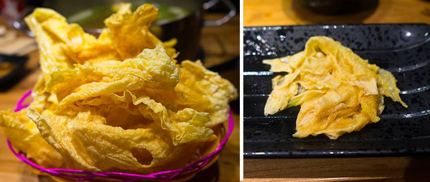 虽然在汕头夜宵中也有卤水烫腐皮这一味,但其实在当地吃牛肉火锅,大家并不会加炸腐皮,后来传到广州加上了这货,以至于现在外地的店里也成了不可或缺的一项。好的炸腐皮,表面气泡均匀而较为小,颜色金黄,用手掰开也是酥脆的质地。
