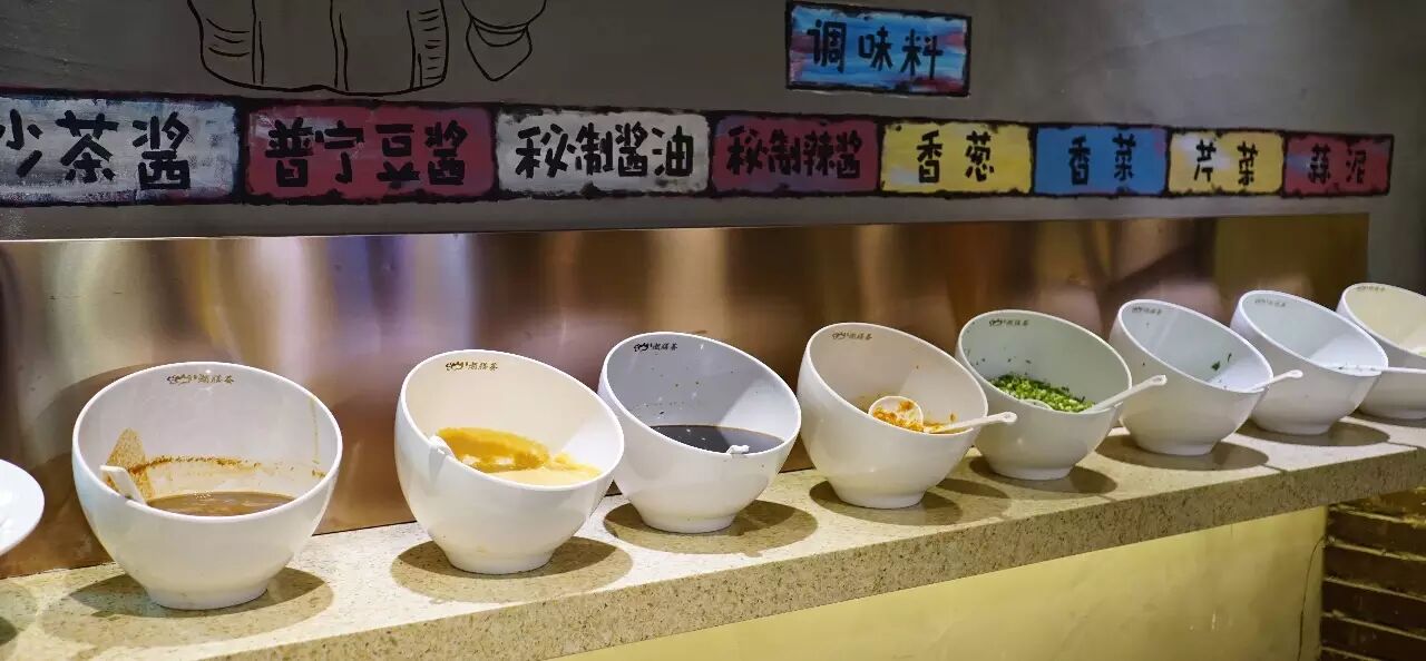 除此之外,也有店家提供炸蒜油等。在外地的店里,为了迎合大众口味,调料选择则更加多了。