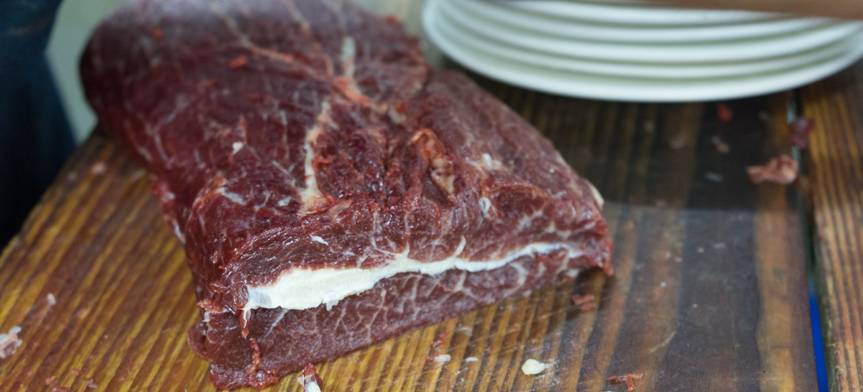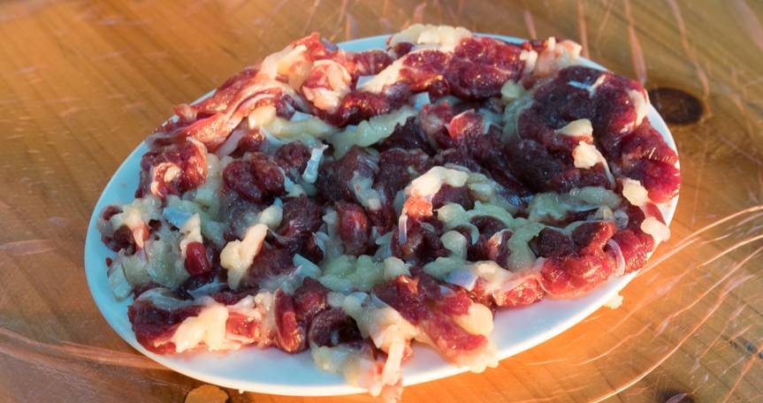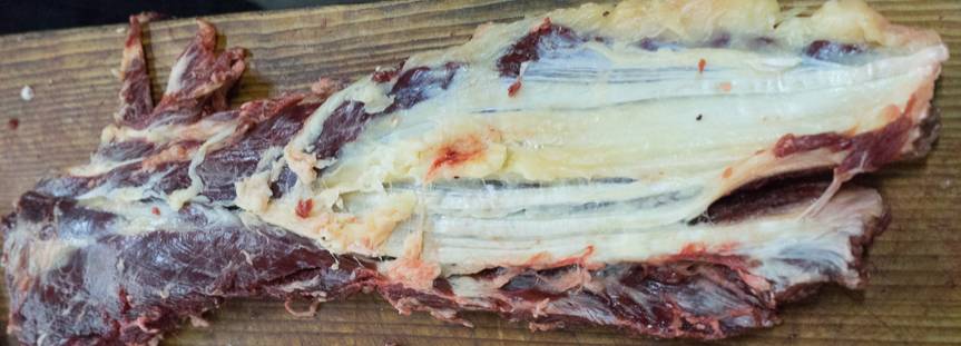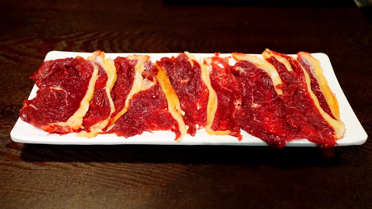 薄切的牛腹部夹层肉,特点就是肥香啦!带着厚厚一层皮下脂肪。好的双层肉切面,可以看到厚厚一层脂肪和红肉的分层,也是可遇不可以求的。