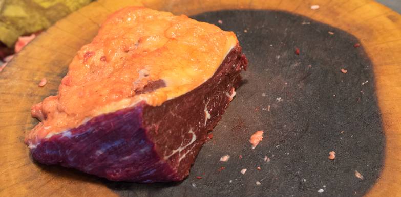 西餐中对应Flank部位。要足够肥的牛,才能有漂亮的切面: