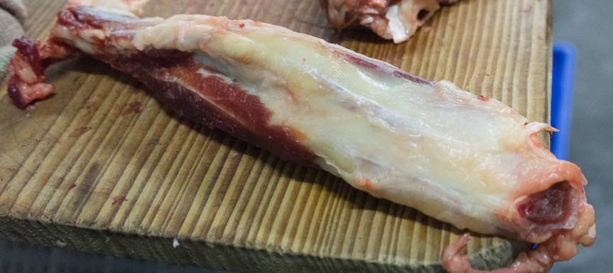 后腿对应三花腱的部位,但更加稀少。筋比三花腱更多,纹路也更明显,口感也更为脆弹。如果你喜欢弹牙的筋肉感的话,会觉得这部分口感更好。