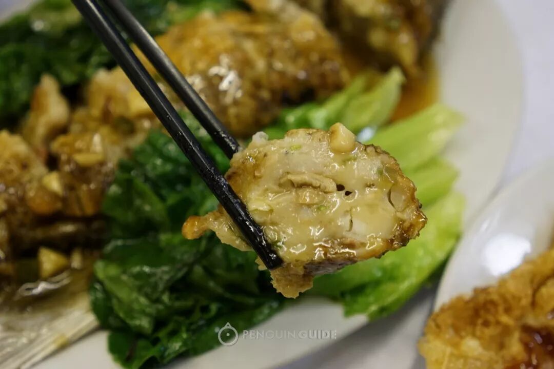 一定要试试酿鲮鱼这道顺德手工菜——整条鲮鱼起皮取肉,混合香菇、马蹄、腊味、肥猪肉等一起剁碎,再酿回鱼身,先炸后蒸。外表看起来还是一条完整的鱼,内里早已乾坤大挪移,骨刺全去。