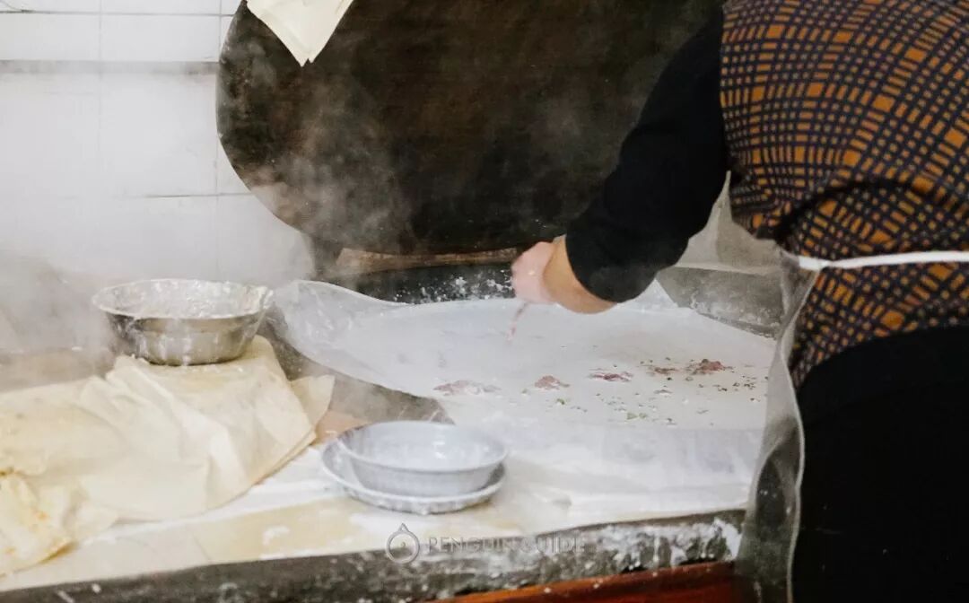 另一边厢,人们挤在灶前,都在等新出炉的肠粉。木柴烧出滚滚蒸汽,老式窝篮直径一米有余,蒸出的肠粉白嫩平整如一匹新棉布,还带着独有的柴火香。