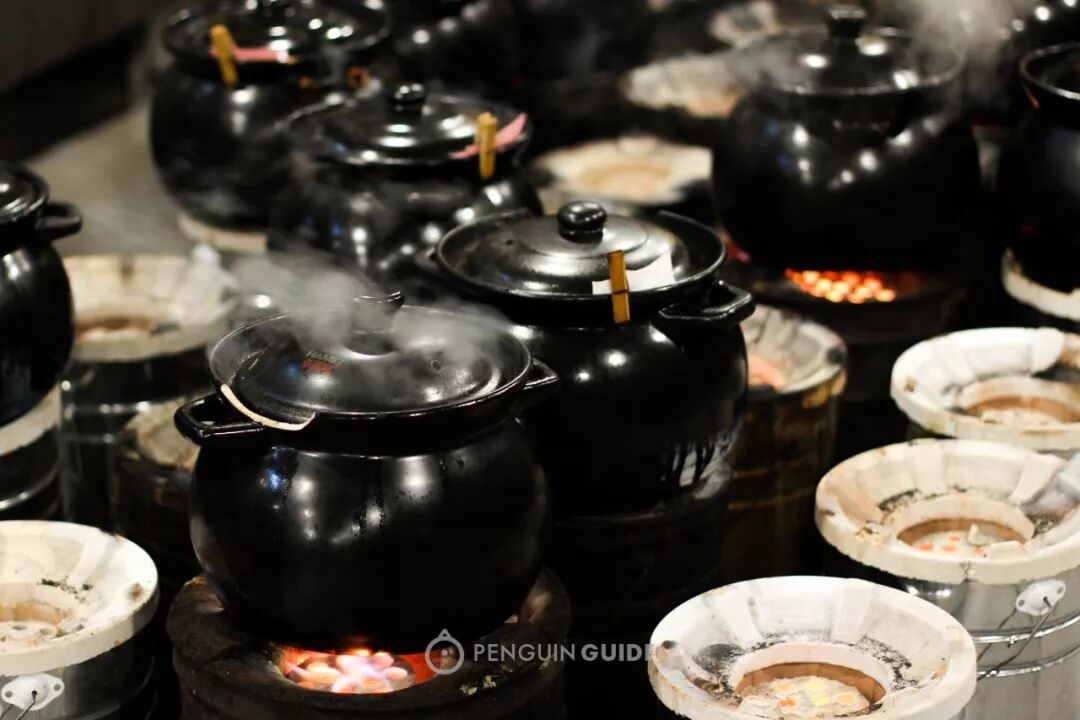 一进店门,几十口炭炉和瓦煲整齐排开,场面壮观!