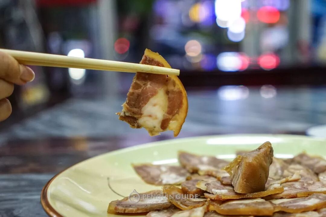 猪皮爽口Q弹,肉与肉之间都结成透明啫哩层,明明蘸料只有酱油和油,却一点也不肥腻,让人一块接一块吃得停不下来。