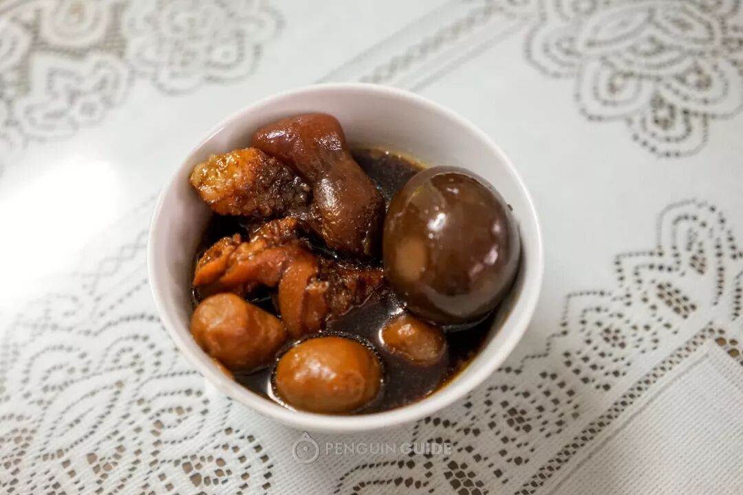 猪脚姜是辉记的人气王。醋下气消食,姜驱寒暖胃,猪手的胶原蛋白带来厚实口感,冬天吃上酸甜浓郁的一碗,浑身都暖了。黑漆漆的鸡蛋是猪脚姜的灵魂,在长时间浸煮下姜醋尽数渗入其中,最后用蛋黄把汤汁全蘸完,美滋滋。