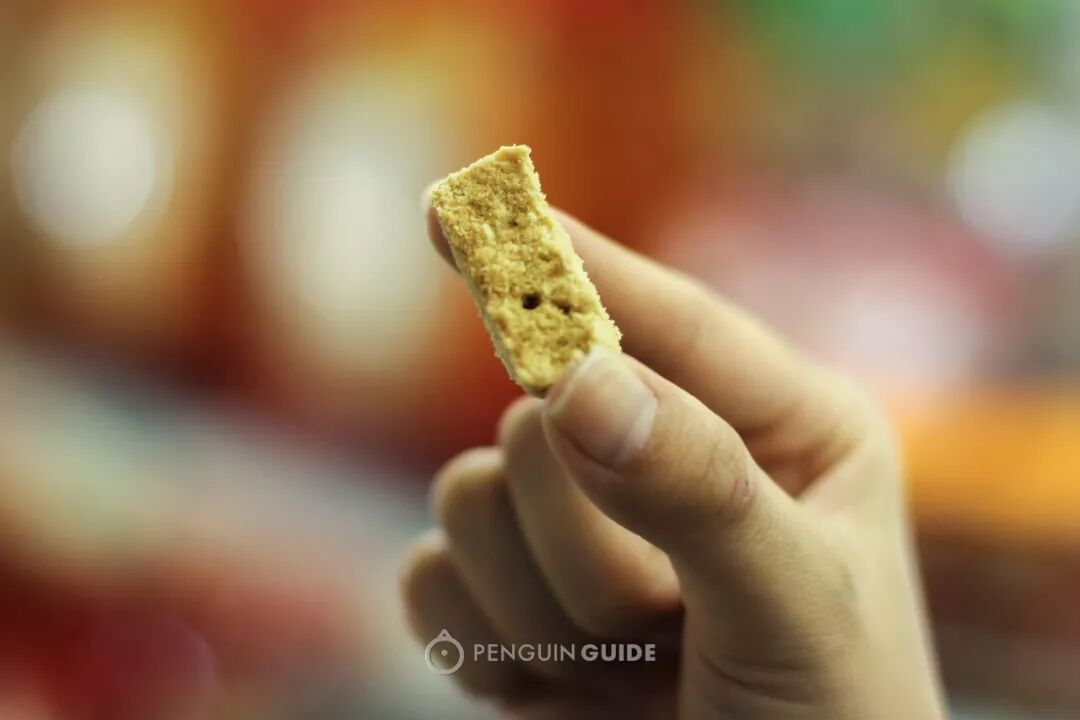 据佛山市志记载,它创制于清嘉庆后期,掐指一算也有两百多年历史。相传一位盲人在佛山祖庙摆摊占卜,为免小孩哭闹,盲人的儿子就用饭焦干磨成米粉,加芝麻、花生、糖,以生油和匀压制烘烤成棋子状的饼食,酥脆又甘香。