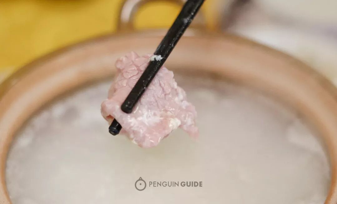 这种火锅来自顺德, 锅底就是简简单单的白粥,像大多数清淡的广式打边炉一样,是一种精巧的美味。在刀工与火候的加持下,它能让食材呈现出最鲜嫩的姿态。