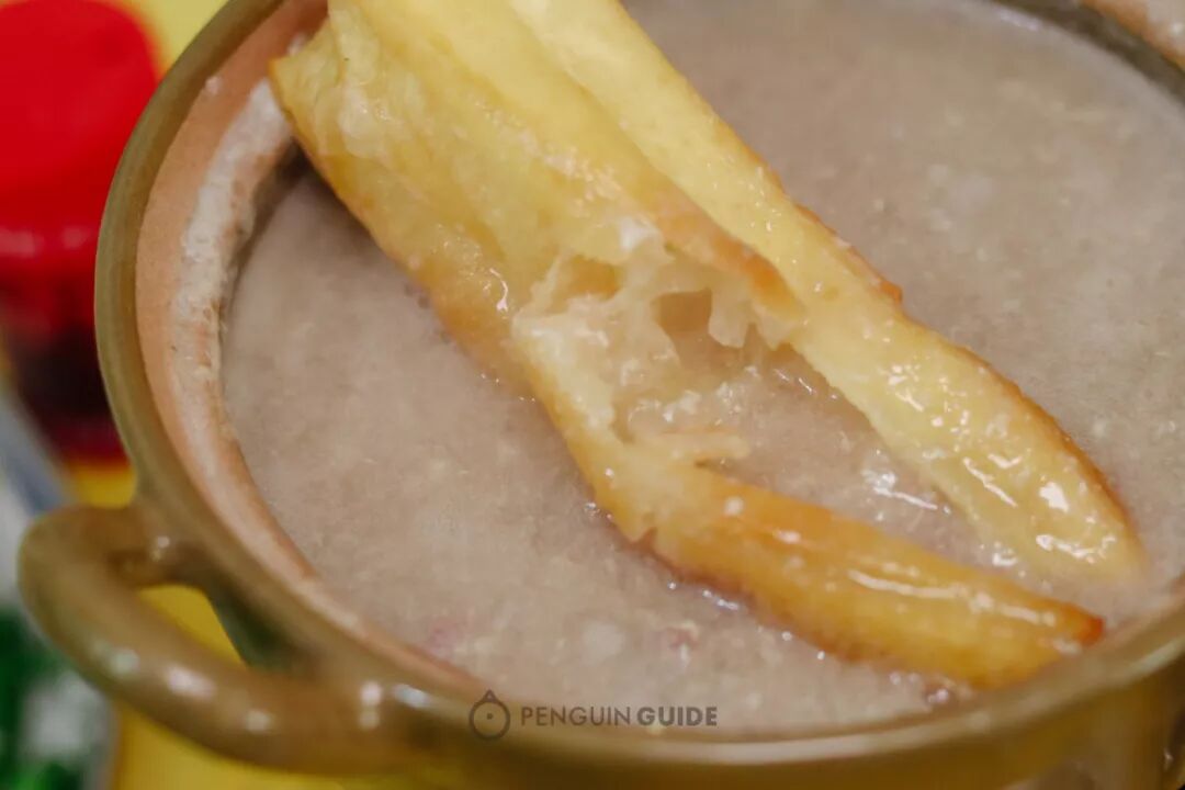 你还可以在锅仔里泡一根油条,用筷子把它剖开,让粥水灌进去,油条的口感变得又糯又韧,还吸饱了粥的鲜甜。