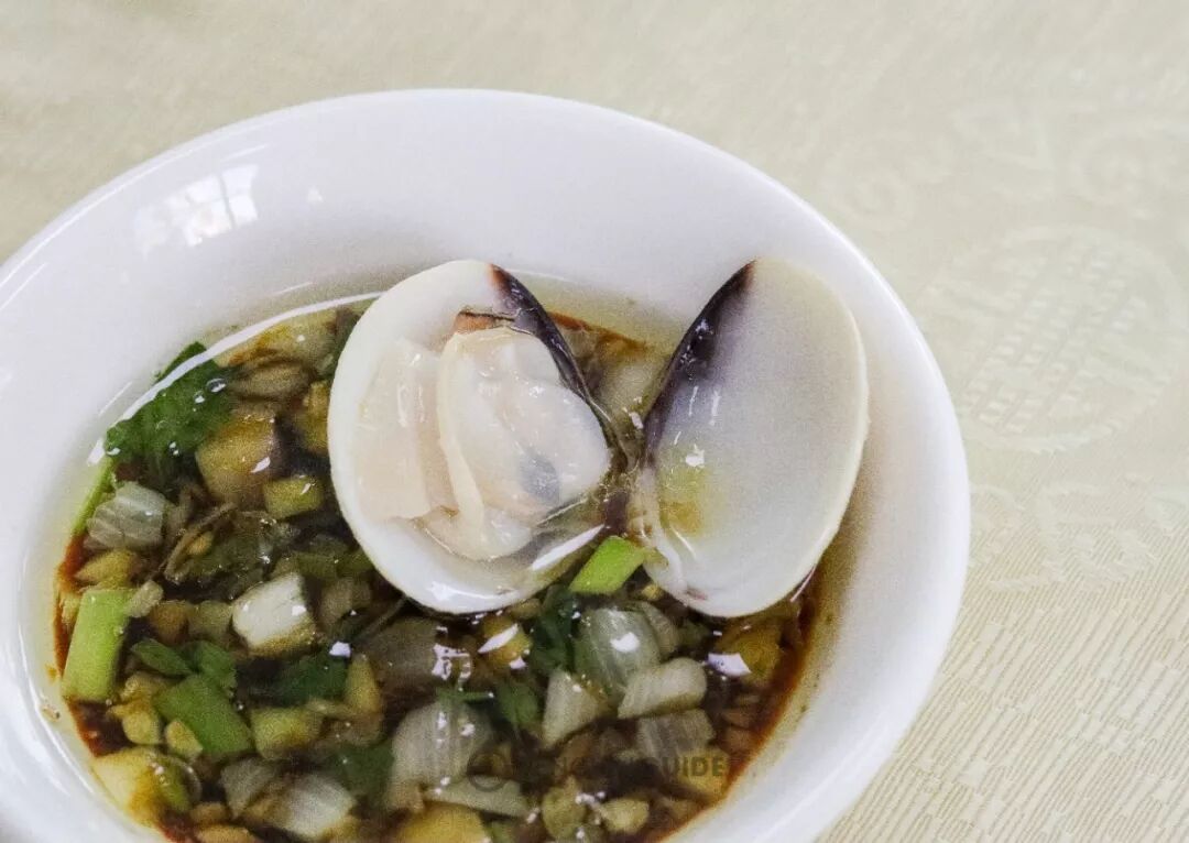 吃一只不加任何调味的新鲜白贝,嘴巴里会回绕甜甜的余韵。如果觉得味道太轻,就放进蘸碟里滚一圈: