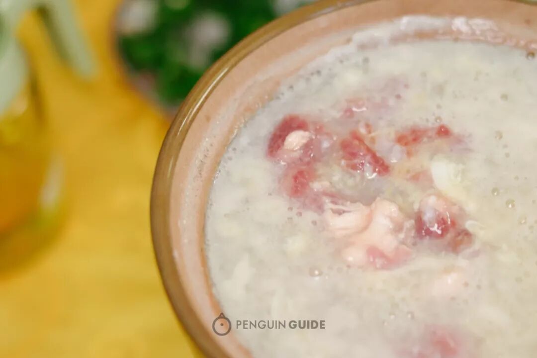 到这,这锅粥水完成又一次变身,粥底的颜色逐渐加深,先前的积累的鲜味和肉味持续堆叠,终于到了最丰盈的时刻: