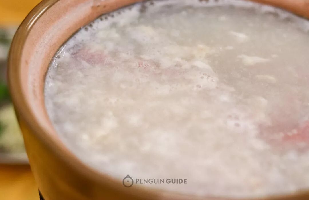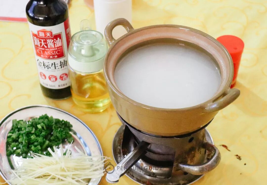 这类店家通常中午和晚上开门,食客以朋友聚餐来的为多。粥水里通常没有米粒,因为大家都坐得远,吃的时候不好照看锅底,留着米容易糊锅。