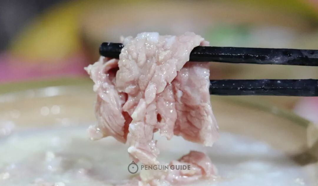 粥的沸点比水高,烫食物更容易熟。涮品也是粥料,用筷子提着在锅里转上几圈,在由生转熟的瞬间捞出,绵密的粥水紧紧裹着食材,能锁住最鲜美的滋味。