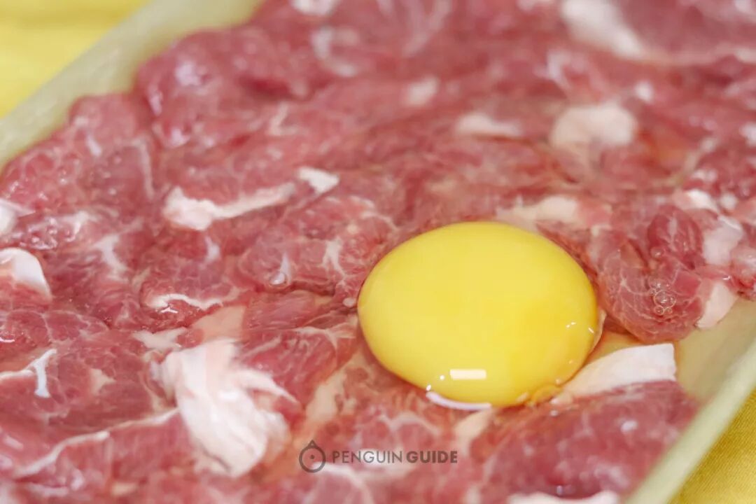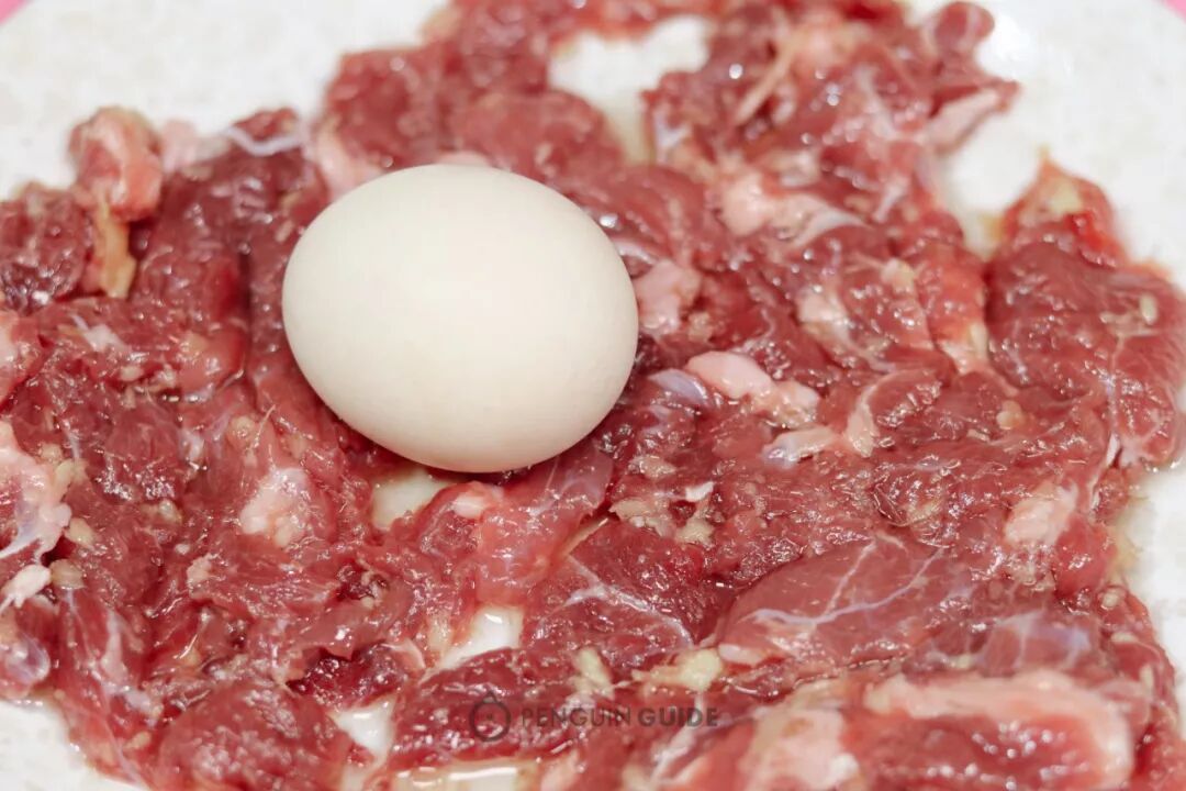 在顺德,一盘牛肉会搭配一只鸡蛋一起上桌,吃之前把蛋打进牛肉里,让蛋液和牛肉片充分搅拌混合。