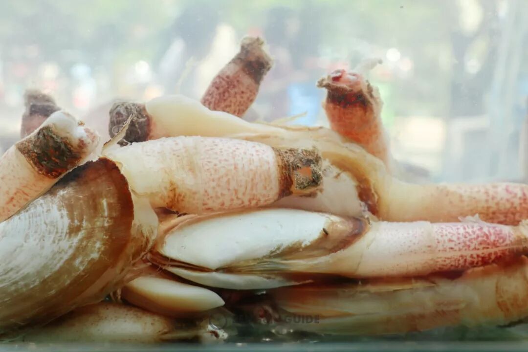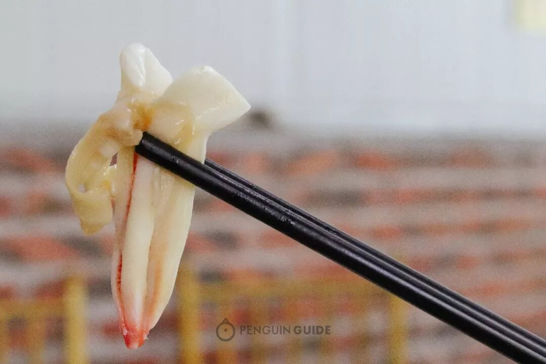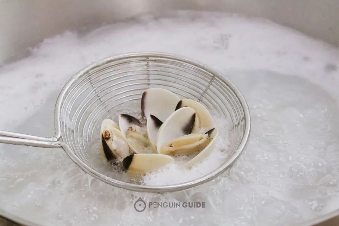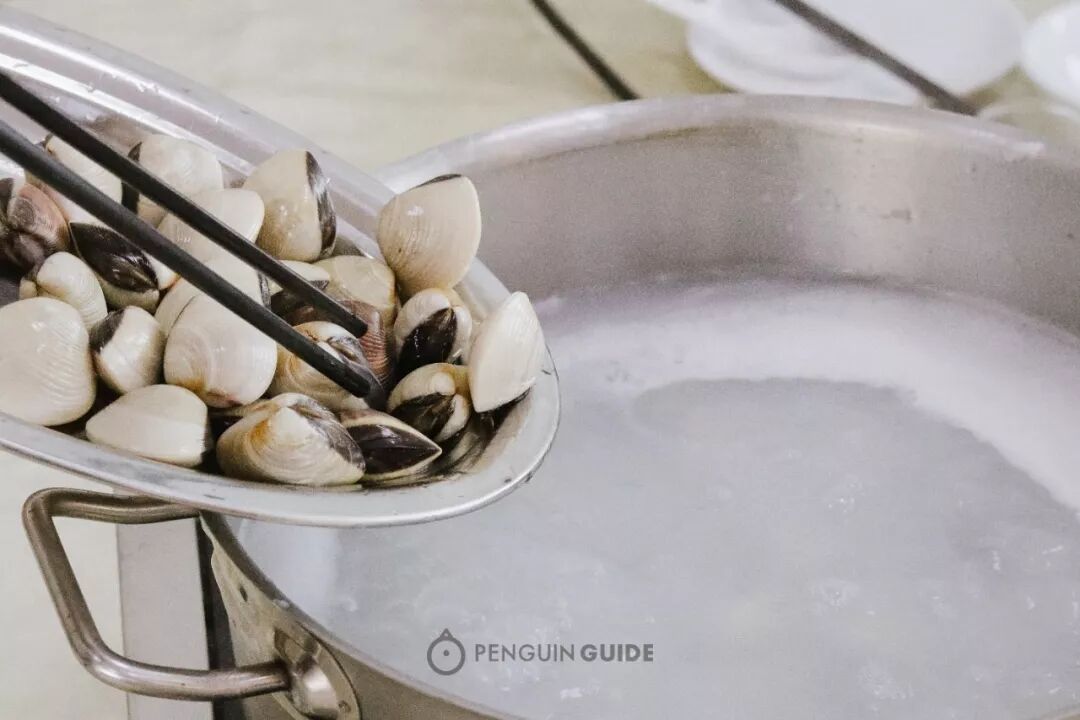 再来下一盘蚌仔,也就是小号的象拔蚌。切片后更容易烫熟,口感劲道弹牙,介于贝类和鱿鱼之间,看起来像一朵花瓣。