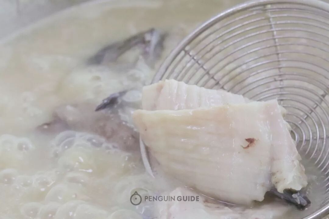 鱼片最怕烫老,下锅后直接关火,用余温烫到微微打卷就可以吃。鲩鱼的肉质细腻,鲜味够顶,粥水裹着鱼肉,有种别样的鲜甜。