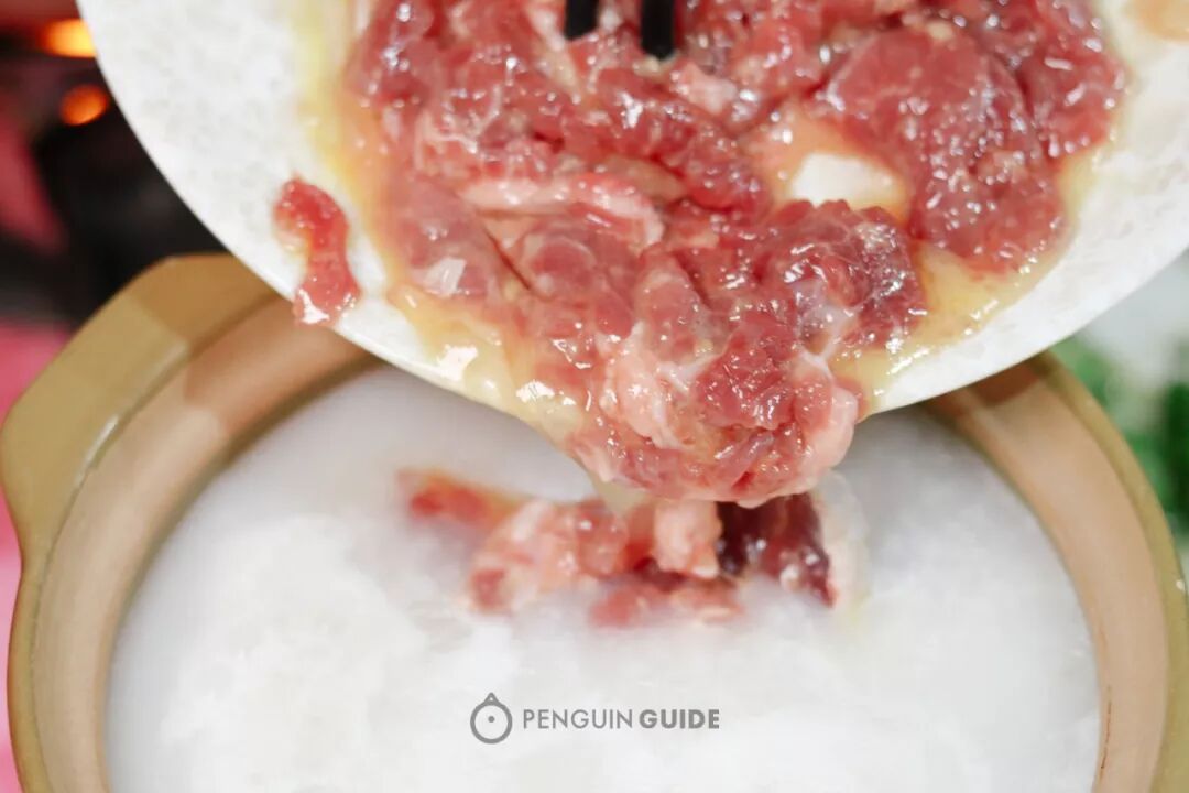 蛋液在煮开的粥水里会散开成为蛋花,几秒钟之后,沸滚的粥水让肉的纤维收缩,米汤瞬间漫进肉片的缝隙里,把牛肉的原味紧紧裹住。